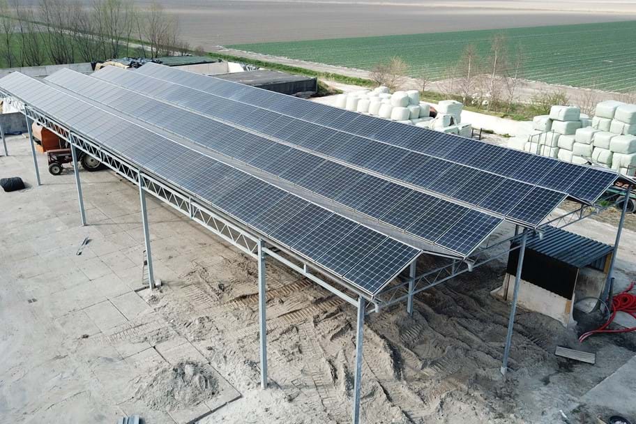Kerklaan Greenhouses lieferte für einen Kunden eine Konstruktion, an der Sonnenkollektoren befestigt wurden. Die Konstruktion besteht aus 4 Stücken von 3,20 m Dächern mit einer Länge von 36 Metern. Die Säulenhöhe beträgt 4,00m, wodurch es dem Kunden möglich ist, die Konstruktion auch als Lagerfläche für seine Maschinen zu nutzen.