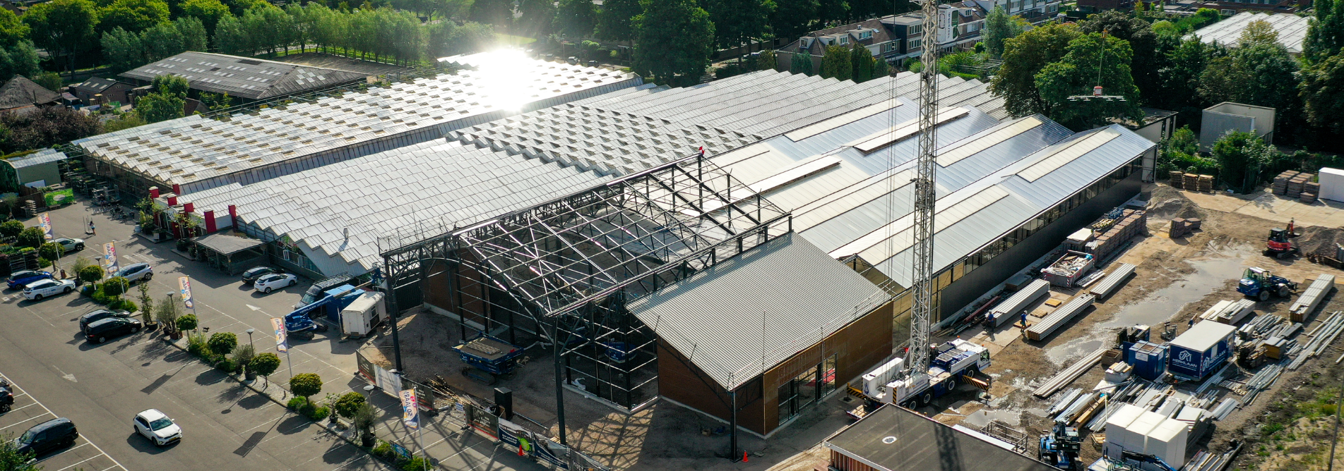 We are realizing a completely overhauled extension of the garden center for De Driesprong Garden Center in Zoetermeer. The design and implementation are fully tailored to the customer's wishes. The eye-catcher of the project is the entrance building, which is made up of elegant arch trusses with an impressive span of no less than 19.20 meters and a ridge height of 13.28 meters.