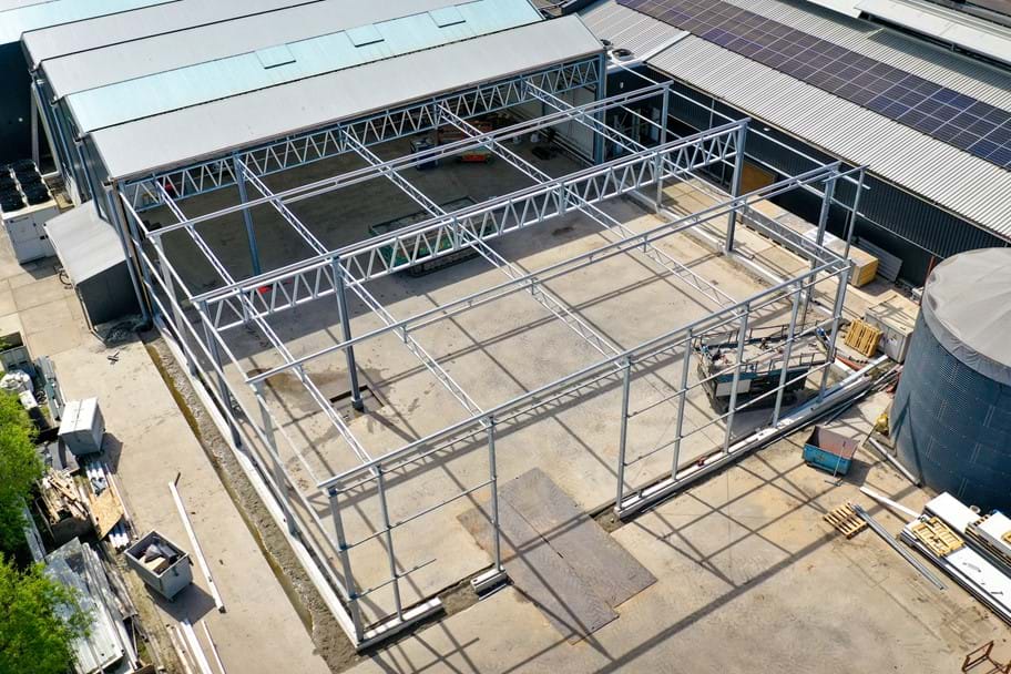 We are building a new business space of 436 m² for Mirial Tulips in Venhuizen. This business space is equipped with special undershot bars of 18.00 m and columns with a height of 6.00 m. The deck and facades are fitted with 60 mm sandwich panels.