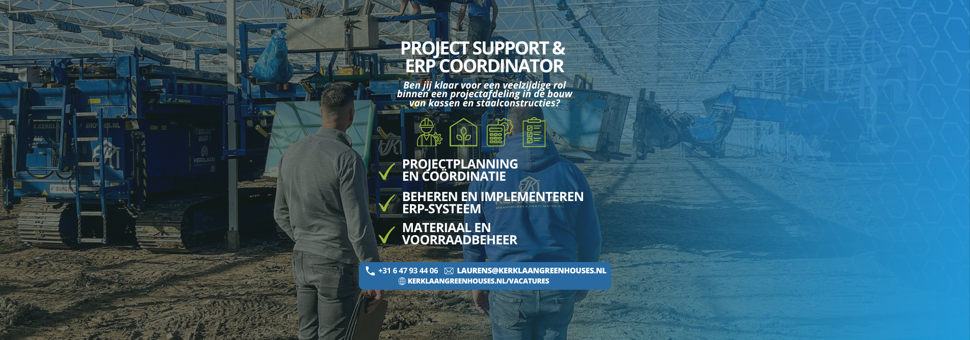 Wij zijn een dynamisch en groeiend bedrijf in de tuinbouwsector, gespecialiseerd in de bouw van gebruikte kassen en staalconstructies in binnen- en buitenland. Om deze groei te ondersteunen, zoeken wij een Project Support & ERP Coördinator die ons team wil komen versterken.